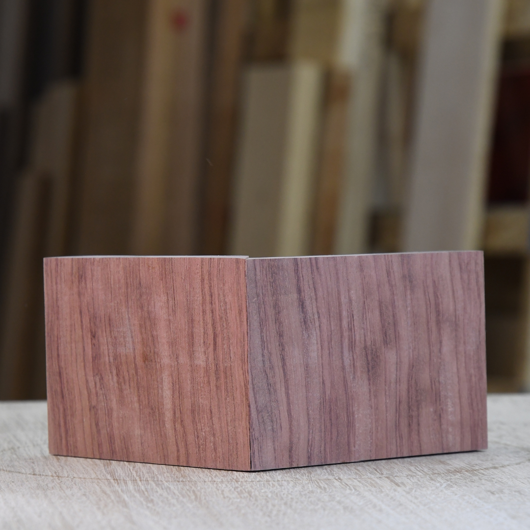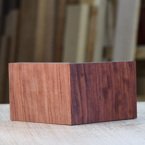 Bubinga is easy to work overall, though depending upon the species Bubinga can have silica present, which can prematurely dull cutting edges. Also, on pieces with figured or interlocking grain, tear-out can occur during planing or other machining operations. Gluing can occasionally be problematic due to Bubinga’s high density and natural oils. Turns and finishes well.